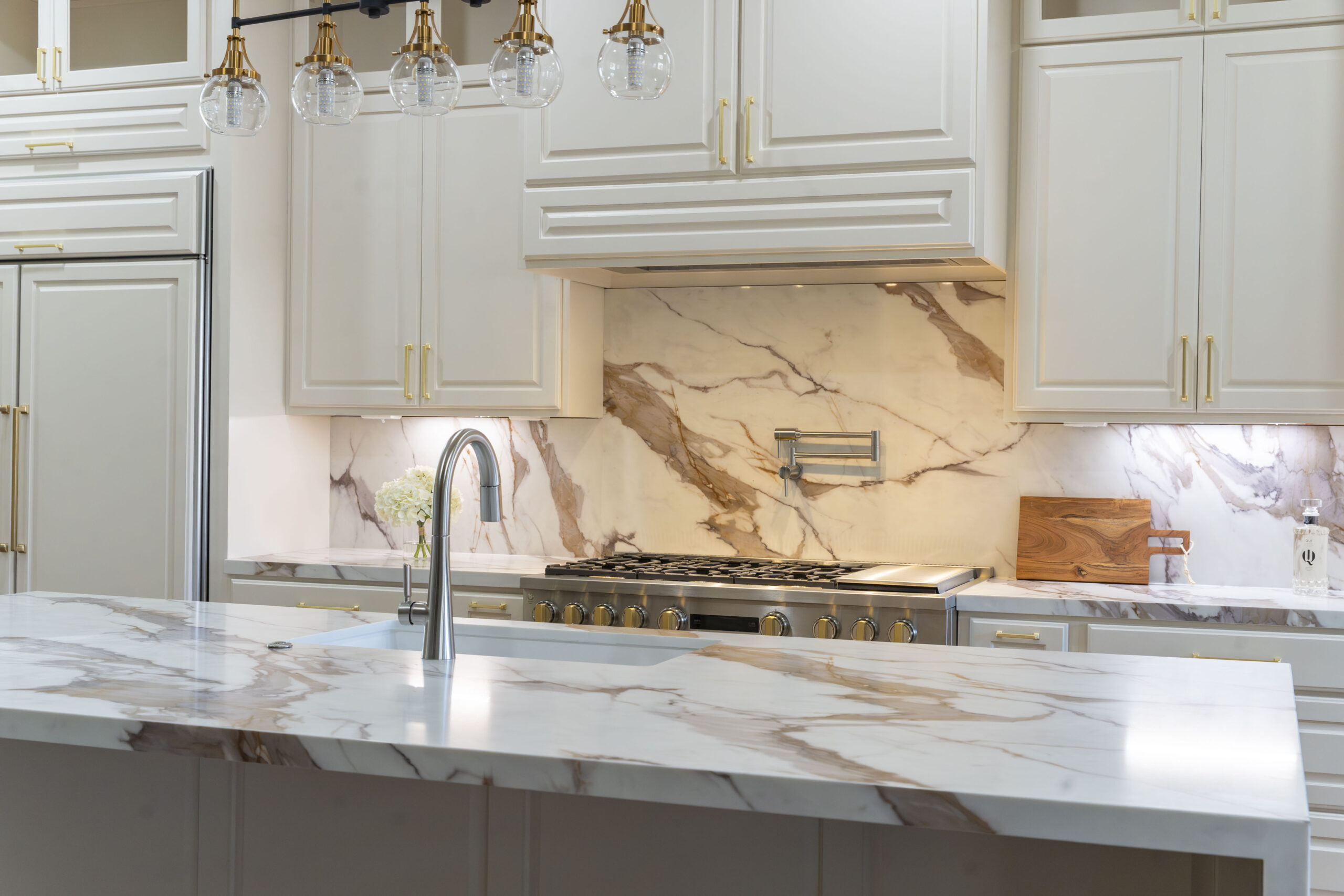 Surfaces The waterfall style island and matching kitchen backsplash set with these custom cabinets is a level of…