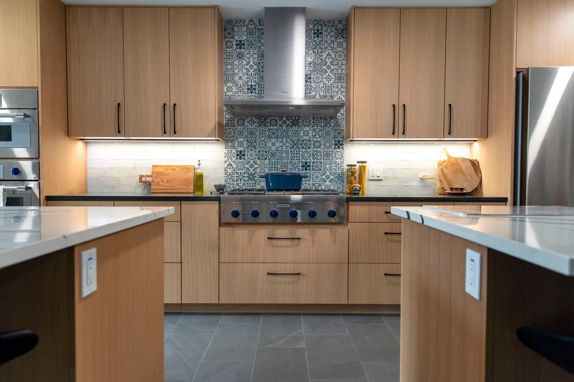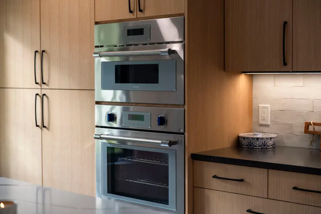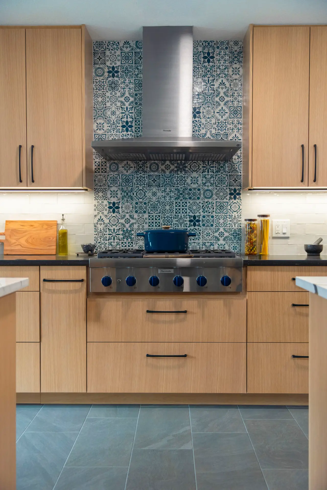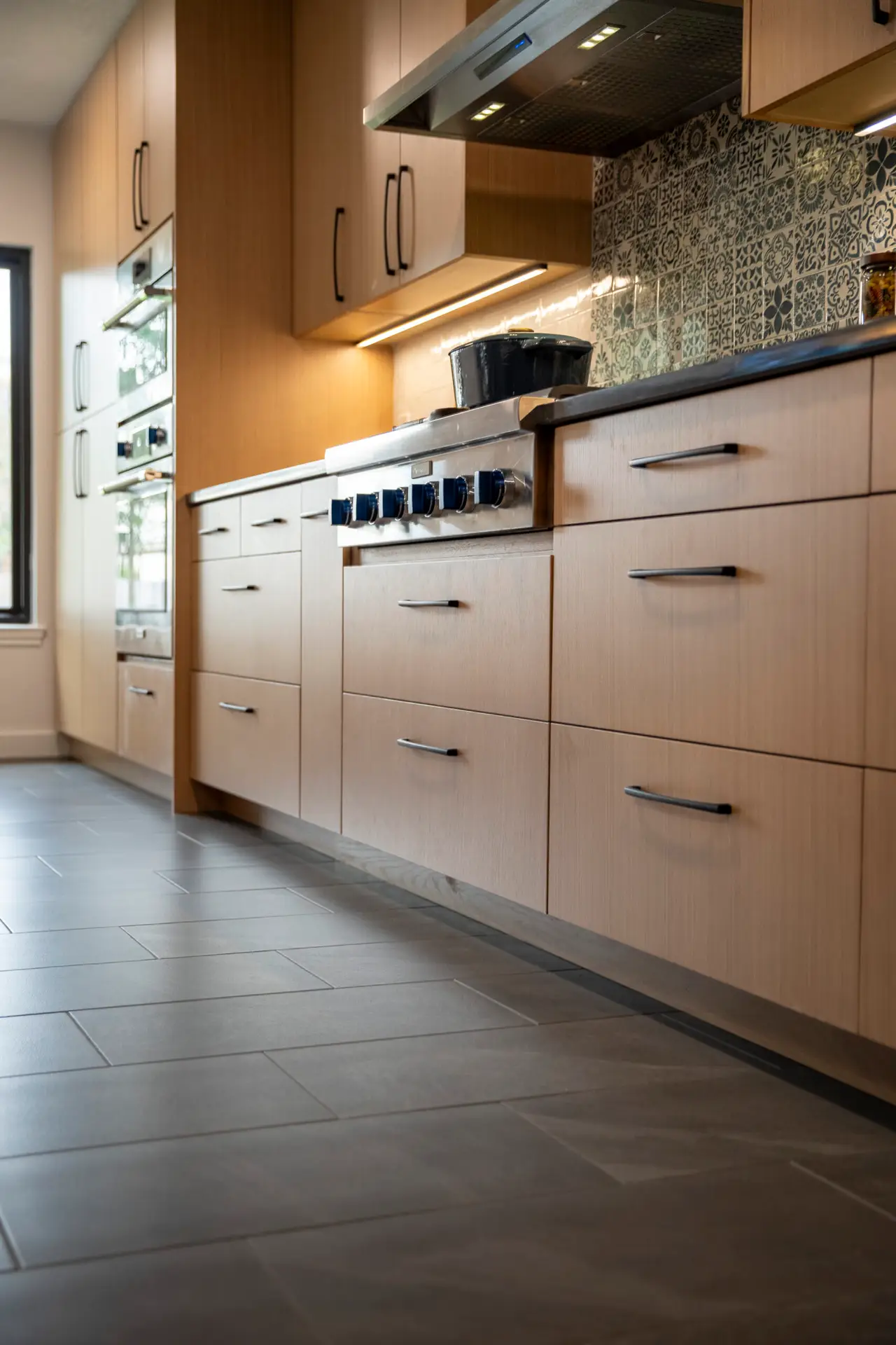 The European style full overlay cabinets are the real piece de resistance. Lighter finish, soft-close hardware, and most notable the drawers under the cooking range. Where there is typically an oven, the custom build was made to house the gas cook top.