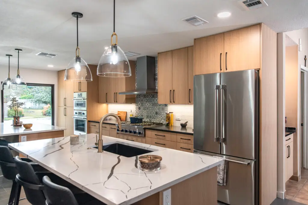 There are some bold choices in this space that work well together. The mosaic tile backsplash, the striking graphic style countertops combined with the black. Even the white tile backsplash catches the eye with it’s glossy finish and textured look.