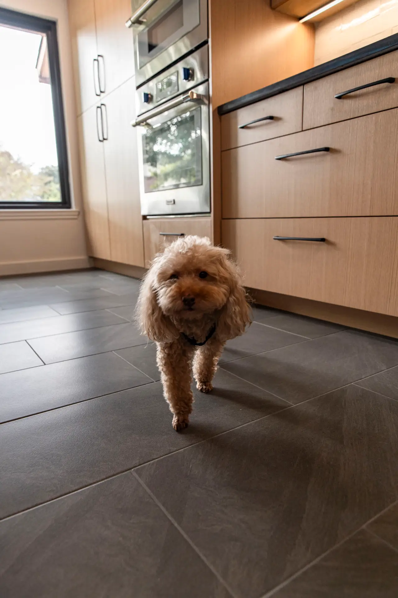 These dark tiles installed throughout the kitchen and living area gave a beautiful visual foundation for all the lighter colors of the walls, cabinets, etc. The right flooring alone can transform a home environment.