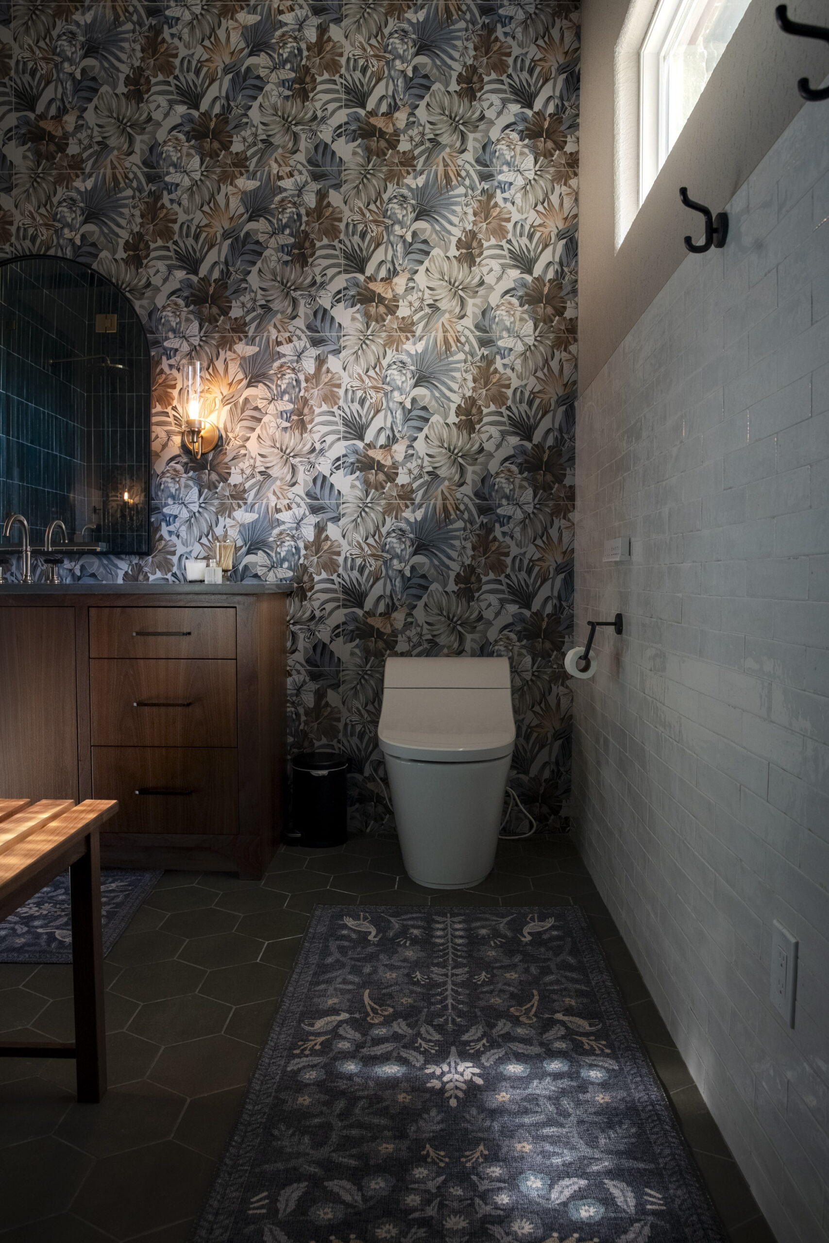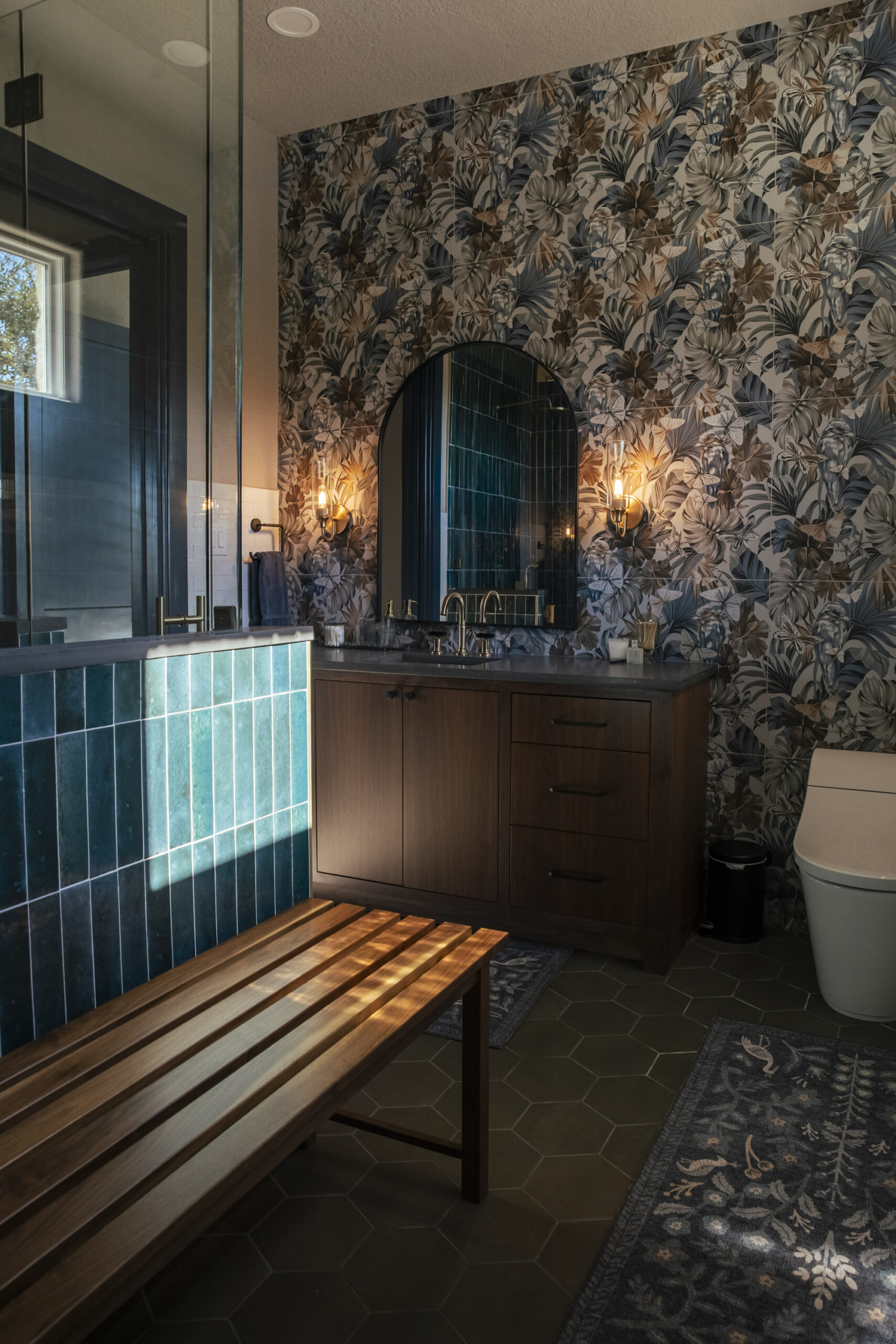 A new build project, we got to design this bathroom from the ground up. One of the most color drenched and moody designed bathrooms we’ve gotten to do, this serves as a bold example of taking a stylistic risk and getting great results. The wallpaper tile and distressed emerald tile are the primary visual anchors while the custom vanity holds down the old world understated luxury.